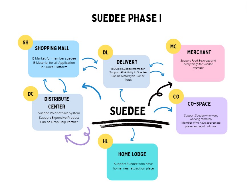 Suedee 帶來了相關產品和服務。讓我們走到一起,在同一個平台上提供服務,建立聯繫,交換產品,我們也扮演合作社的角色。在線上與所有與我們一起參與的會員分享結果。